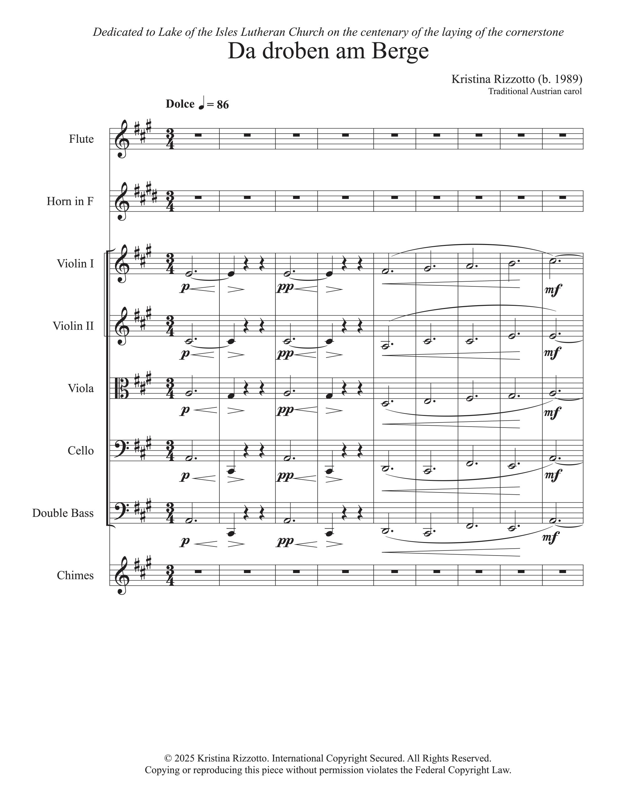“Da droben am Berge” (also known as “Da droben vom Berge”) is a traditional Austrian Christmas carol, specifically originating from the Salzburg region. In English, the title is often translated as “Up on the Mountain” or “Away Upon the Mountain Top”. The song is a staple of Alpine folk culture. I dedicated this composition to Lake of the Isles Lutheran Church in Minneapolis, where I am the Director of Music, on the centenary of the laying of its cornerstone.