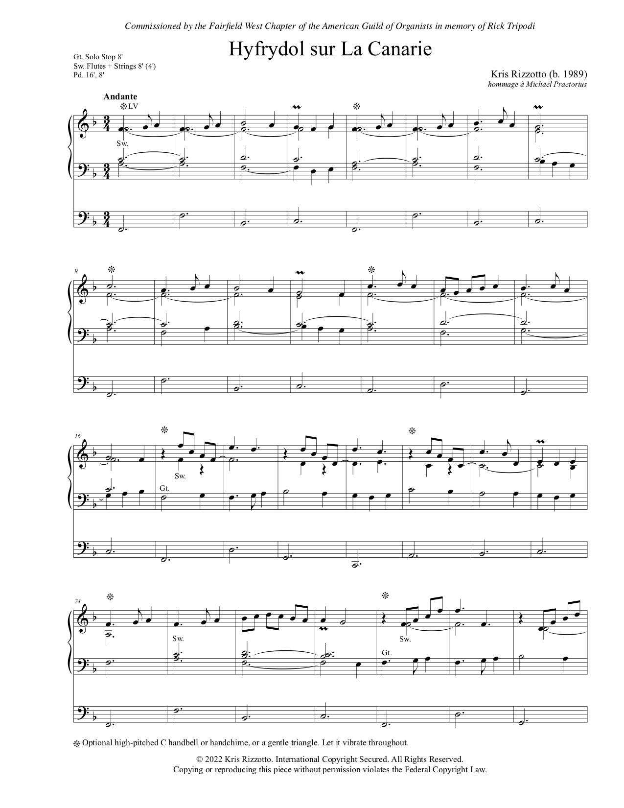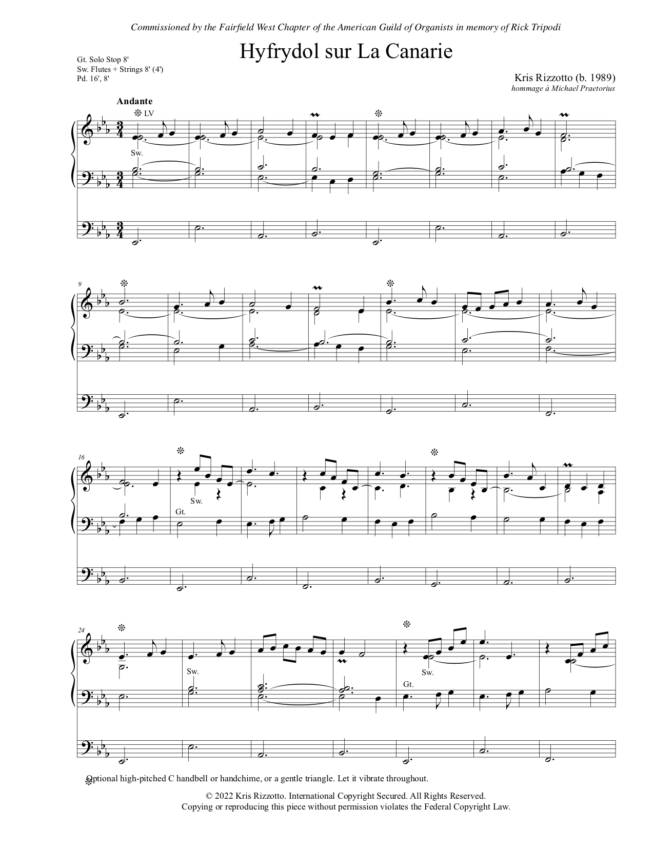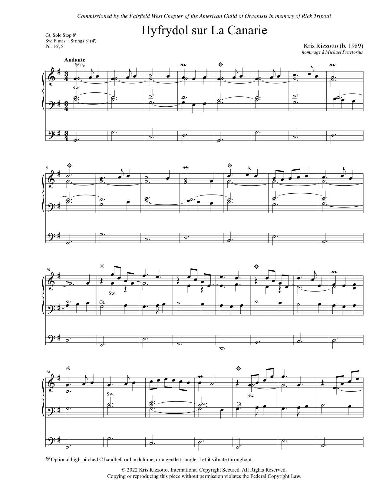 Hyfrydol sur La Canarie was commissioned by the Fairfield West Chapter of the American Guild of Organists in memory of Rick Tripodi. It combines the tune to Love Divine, All Loves Excelling with La Canarie, a dance which comes from the Canary Islands and was brought to Spain in the sixteenth century, and whose choreography features jumps, leaps, and percussive footwork. In the Canary Islands it was associated with both funeral rites and courtship. This melody was famously included in Michael Praetorius’ Terpsichore, a compendium of more than 300 instrumental dances published in 1612.