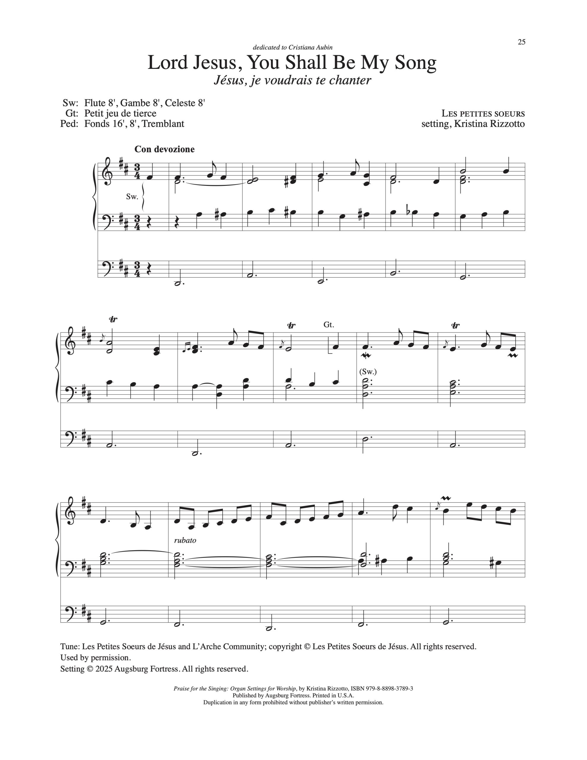 Hymn introduction to “Lord, Jesus, You Shall Be My Song” or solo piece by Dr. Kristina Rizzotto using the tune LES PETITES SŒURS. I was inspired by the French classical organ tradition of the Baroque period, particularly the ornamented style of a récit de nazard. This composition was dedicated to my dear friend Dr. Cristiana Aubin on her birthday, July 15, the day after the French National Day (known in the English-speaking countries as Bastille Day). It is published by Augsburg Fortress in a volume of fourteen chorale preludes by Dr. Kristina Rizzotto, available for digital download or as a printed book.