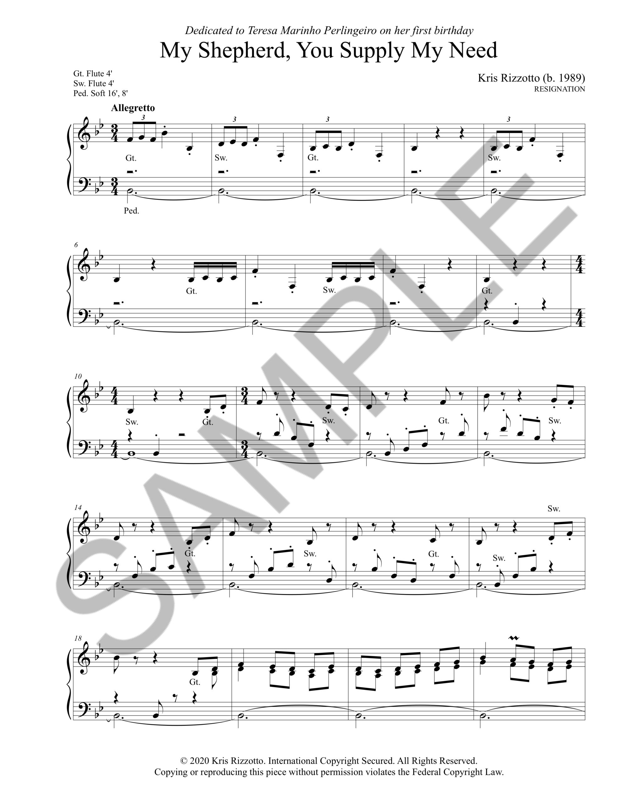 This pastorale on RESIGNATION works both as an introduction to the Easter hymn “My Shepherd, You Supply My Need” or as a solo piece. Shepherd’s flutes in echo grounded on the pedal drone paint the bucolic picture for this musical setting of Psalm 23. I dedicated it to my young cousin Teresa Marinho Perlingeiro on her first birthday, which this year (2020) happened in the week leading up to Good Shepherd Sunday, the Fourth Sunday of Easter.