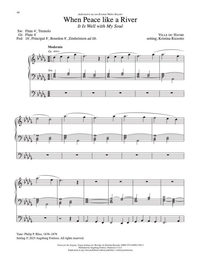 This piece on VILLE DU HAVRE works both as an introduction to the hymn “It Is Well with My Soul” (When Peace Like a River) or as a solo piece. I dedicated it to my son Kristian Walter Rizzotto.